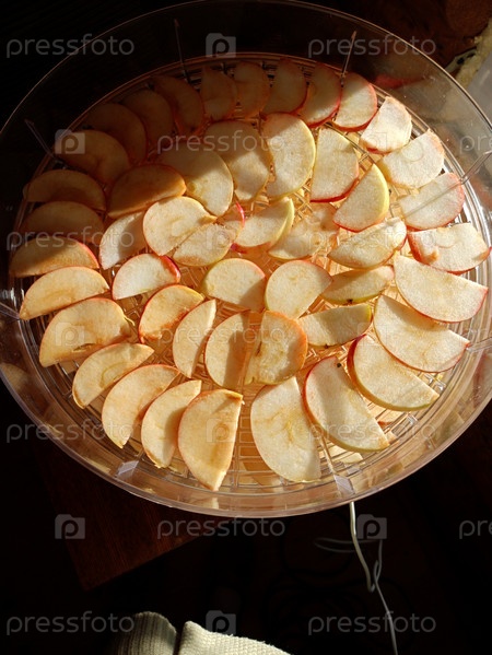 Нарезанные яблоки в электрической сушилке — вид сверху