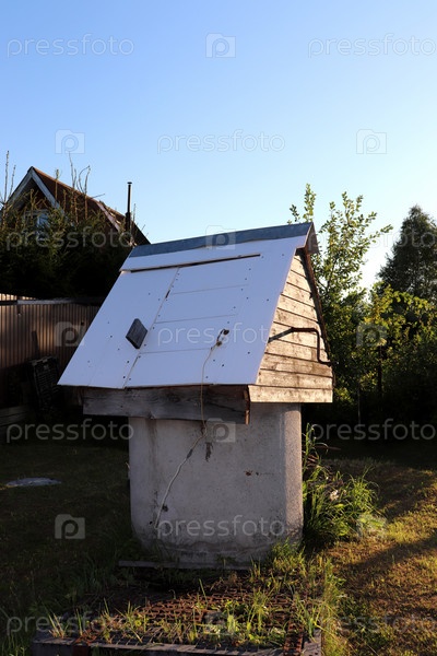 Круглый каменный колодец с деревянной крышей и дверью