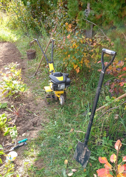 Мотоблок, лопата в саду
