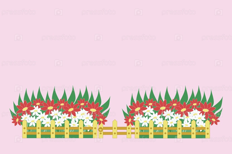 Сиреневый фон цветник с низким деревянным забором и воротами