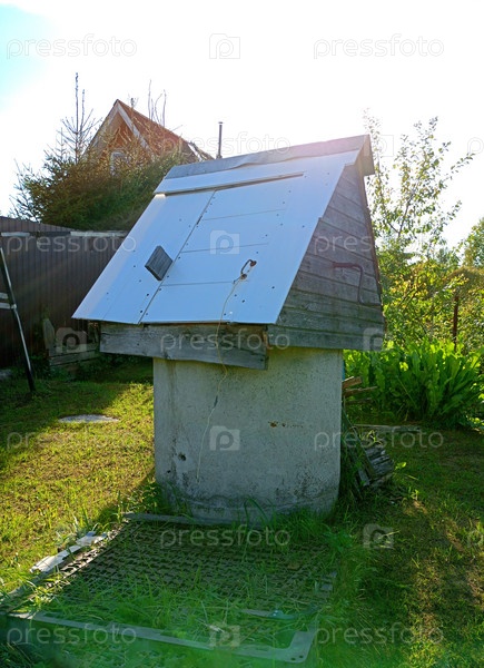 Круглый каменный колодец для добычи воды с деревянной крышей