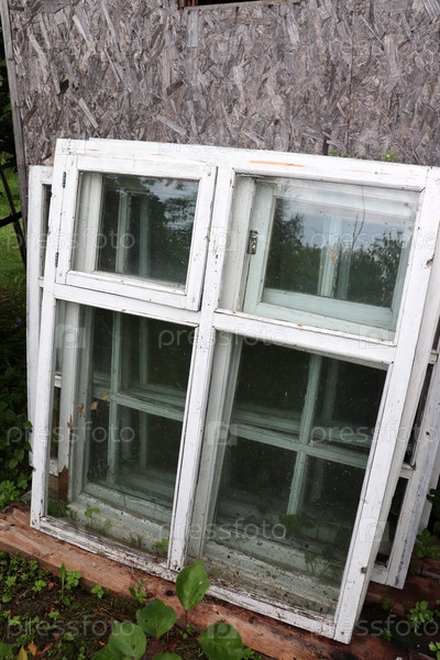 Старые деревянные оконные рамы со стеклянной стойкой на земле