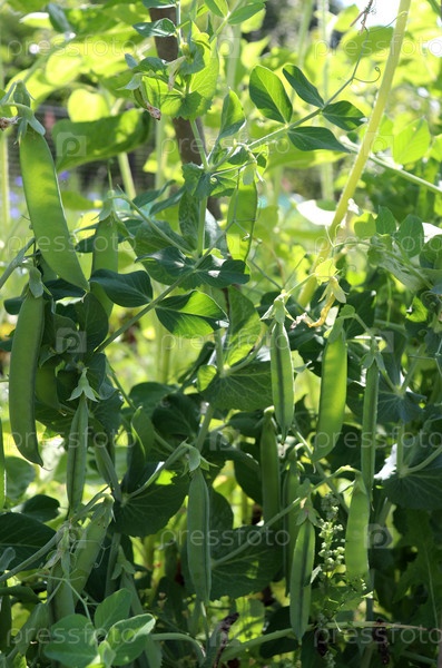 Стручки созревающего зеленого горошка на грядке