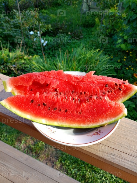Кусочки спелого арбуза на тарелке на деревянных перилах крыльца