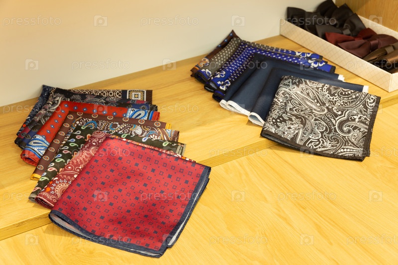 Набор стильных мужских носовых платков к деловому костюму на прилавке бутика мужской одежды и аксессуаров