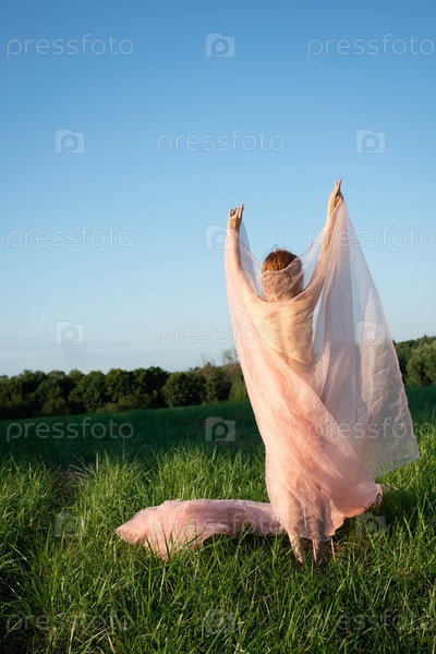 Молодая красивая женщина стоит летом в поле с тканью