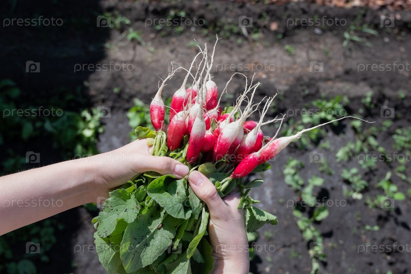 Фиолетовый и красный редис, свежесобранный в саду