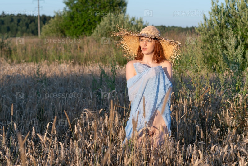 Молодая красивая женщина стоит летом в поле с тканью