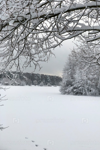 Зимний пейзаж озера с поверхностью, покрытой снегом, и небольшим островом с голыми заснеженными деревьями вдалеке