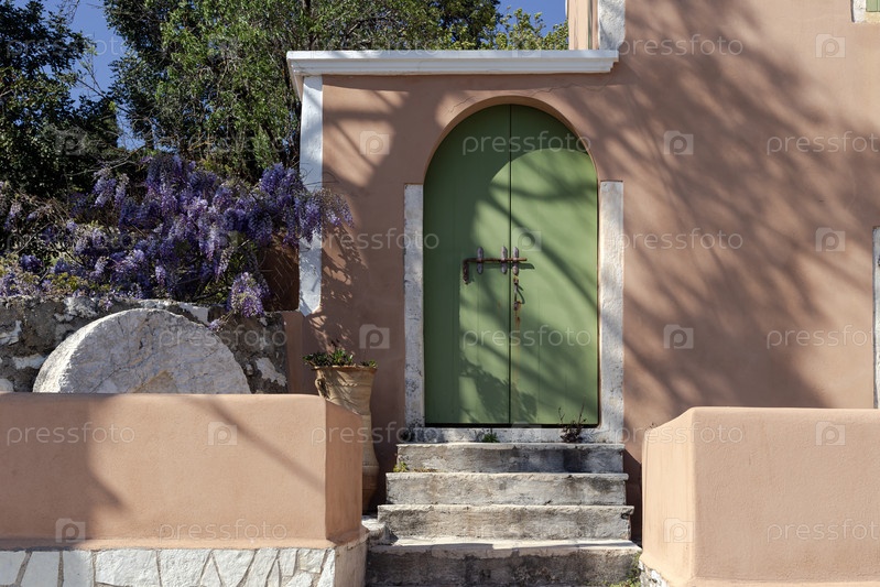 Ветви глицинии (Wisteria sinensis) растут возле зеленой двери