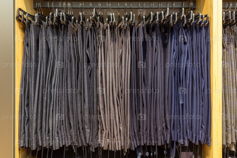 Мужские классические брюки на вешалках в бутике. Витрина со множеством мужских брюк, висящих на вешалках, на вешалках в магазине мужской одежды