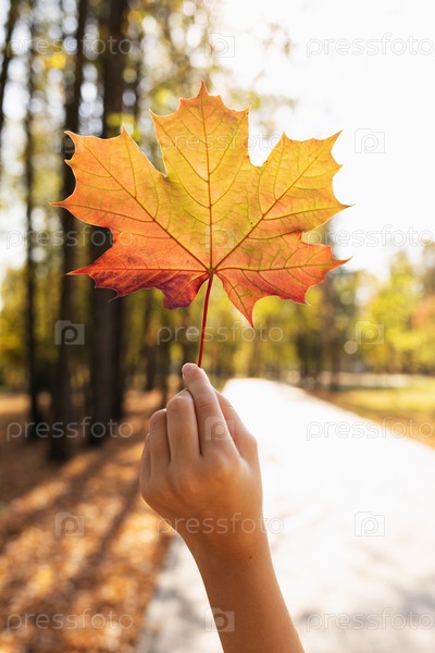 В руке осенний кленовый лист, освещенный солнечным светом сзади на фоне парка