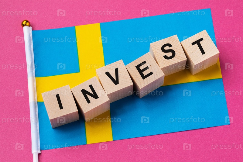 Флаг Швеции и деревянные кубики с текстом на цветном фоне, концепция на тему инвестиций