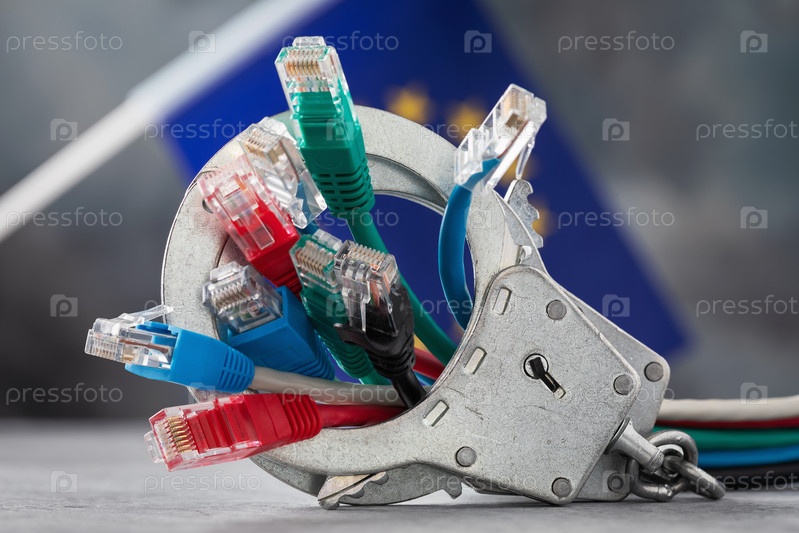 Закрытые наручники на сетевых проводах и флаг ЕС на абстрактном фоне, концепция наказания за преступления в сети