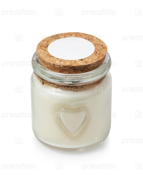 Закрытая стеклянная банка с ароматической свечой внутри, изолированная на белом фоне