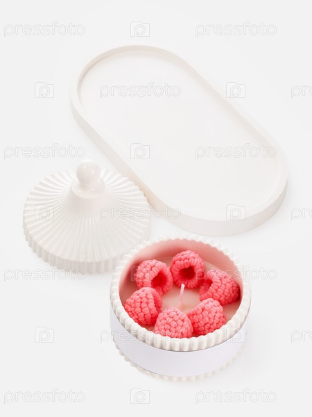 Ароматическая свеча с ароматом малины в керамической подставке на светлом фоне