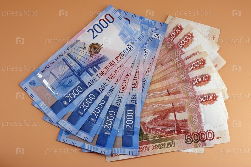 Купюры российских денег номиналом две и пять тысяч. российские деньги