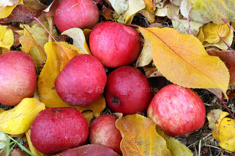 Красные спелые яблоки в каплях дождя лежат в желтых осенних листьях