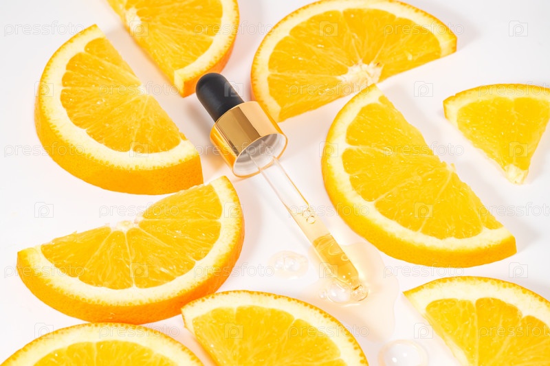Брендинговый макет стеклянной бутылки-капельницы. Косметическая пипетка. Модный фон с нарезанными апельсинами. Концепция органической и косметической косметики. Резкий солнечный свет. Вид сверху