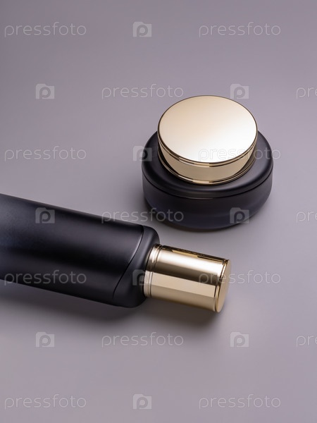 Набор средств по уходу за кожей. Роскошный крем для лица в баночке и тоник во флаконе. Макет упаковки косметики