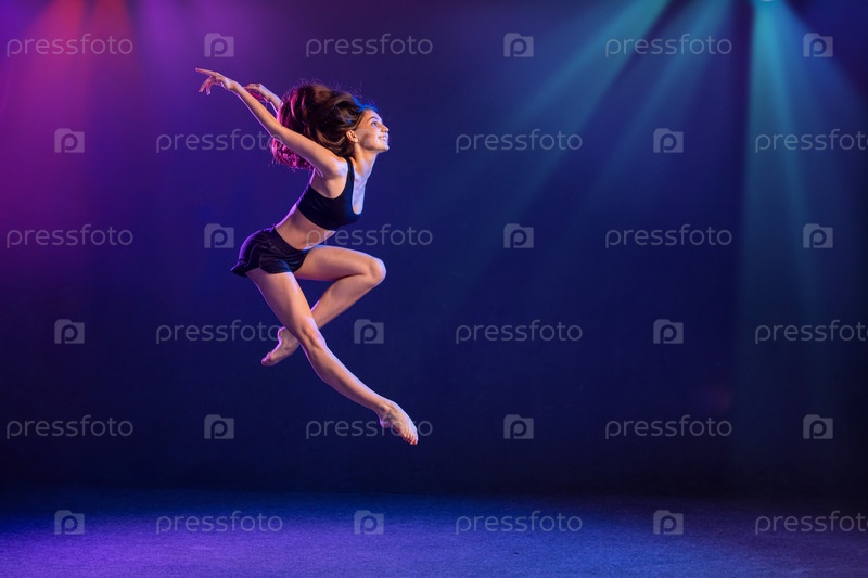 Красивая молодая исполнительница современной хореографии танцует в центре внимания на черном фоне