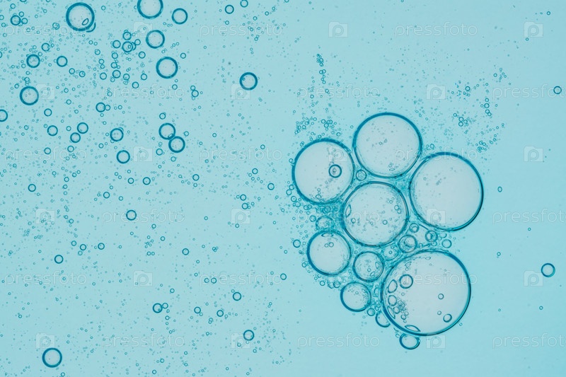 Голубой фон текстуры макроса пузыря жидкого масла. Абстрактное косметическое мыло с изображением омега-витаминов. Свежая капля коллагена кожи на поверхности стекла. Чистый гель
