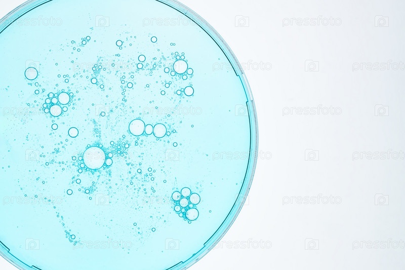 Прозрачные капли сывороточного геля косметического продукта в чашке Петри. Жидкая текстура с пузырьками на синем фоне. Средства по уходу за кожей, натуральная косметика. Концепция красоты по уходу за лицом и телом