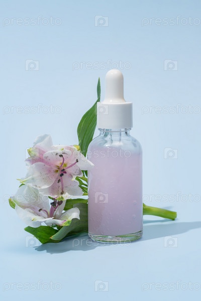 Сыворотка с цветочными экстрактами для ухода за кожей. Природная косметика в стеклянной бутылке с пипеткой и розовыми цветами альстромерии на синем фоне. Концепция спа-салона по уходу за лицом и телом