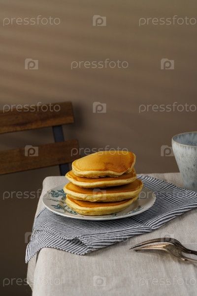 Стопка блинов с медом на старинной тарелке на столе. Завтрак
