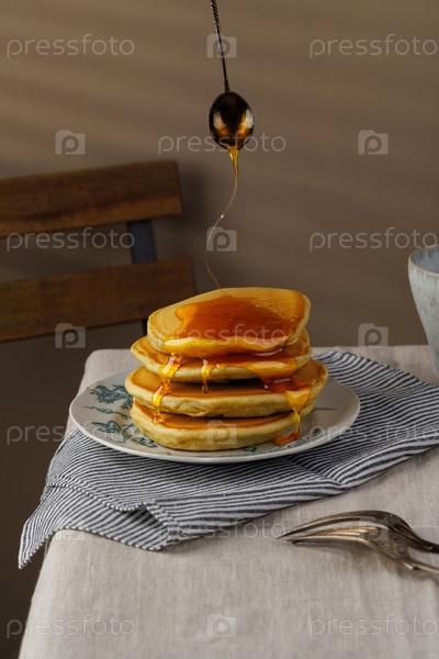 Стопка блинов с медом на старинной тарелке на столе. Завтрак