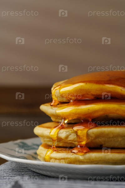 Стопка блинов с медом на старинной тарелке на столе. Завтрак