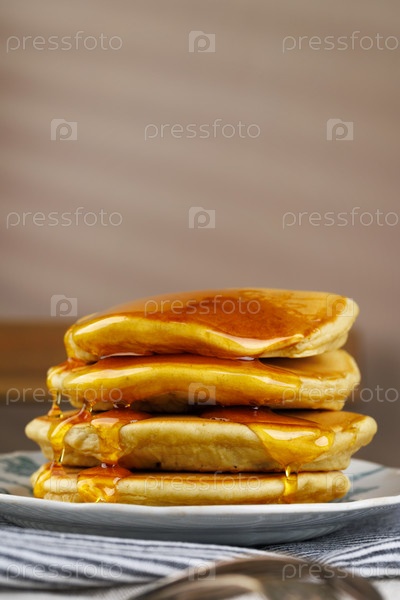 Стопка блинов с медом на старинной тарелке на столе. Завтрак