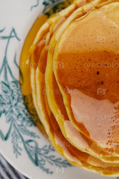 Стопка блинов с медом на старинной тарелке на столе. Завтрак