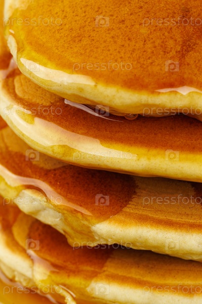 Стопка блинов с медом на старинной тарелке на столе. Завтрак