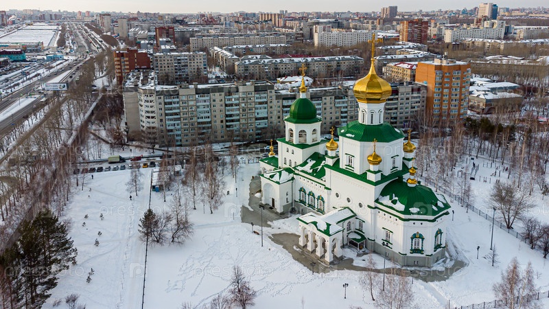 Тюмень, Россия - 16 марта 2021 года: Вид с воздуха на храмовую часовню в честь Дня леди