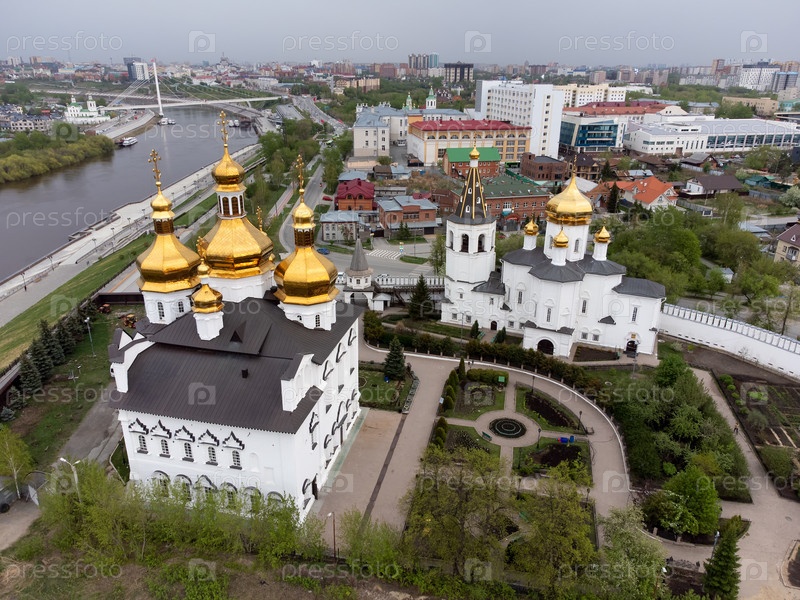 Тюмень, Россия - ??? 13, 2022: Вид с воздуха на Свято-Троицкий монастырь. Церковь Святых Петра и Павла и Свято-Троицкий собор