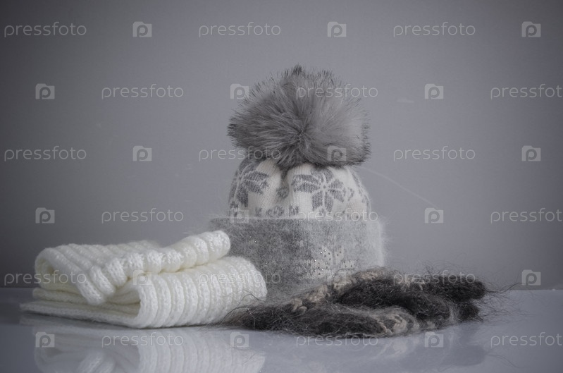 Зимняя шапка, кожа и варежки на столе