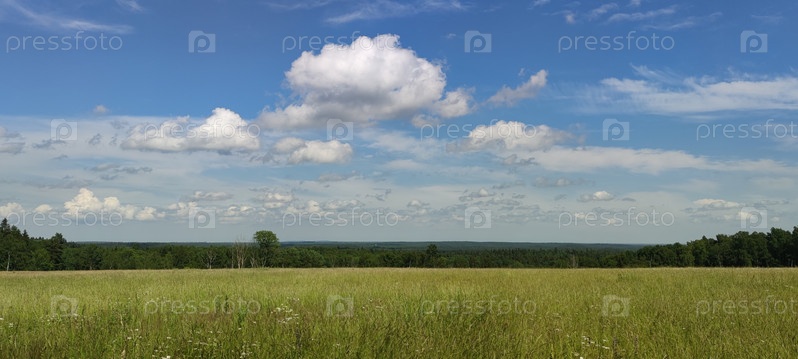Зеленое поле под облаками. В солнечный летний день на голубом небе висят небольшие кучевые облака. Под ними зеленый луг с высокой травой и полевыми цветами. Вдалеке виден лес