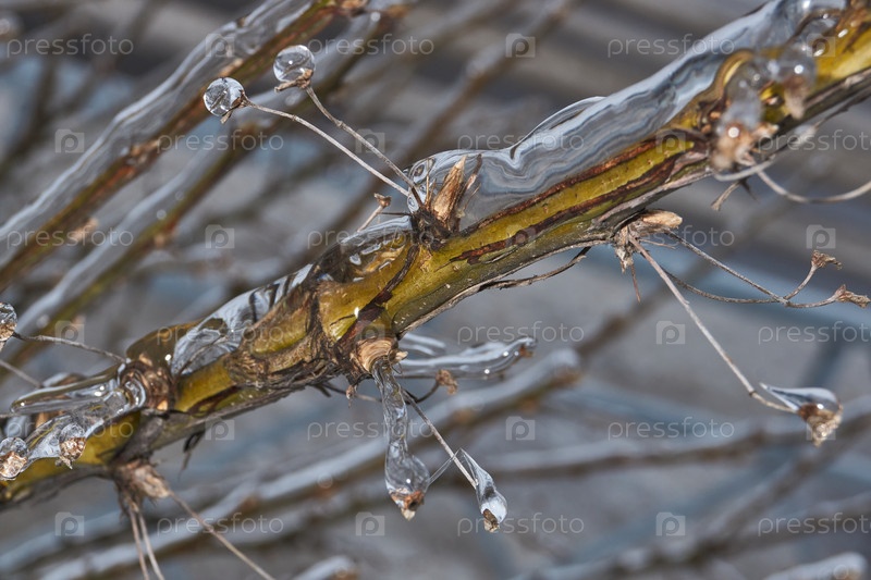 Растения после ледяного дождя. Ветви растений и побеги покрыты льдом. Ледяные ветки растений, последствия ледяного дождя