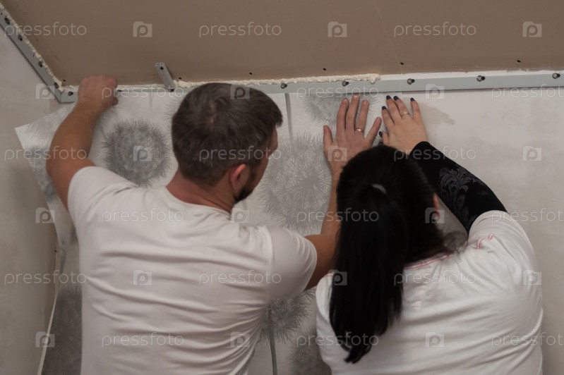 Молодая пара, мужчина и женщина наклеивают обои