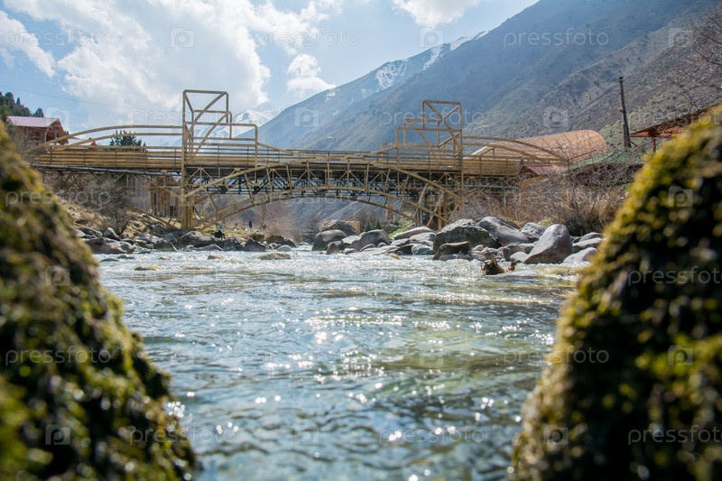 Вид на реку Аламедин из-за глыб на фоне моста и гор