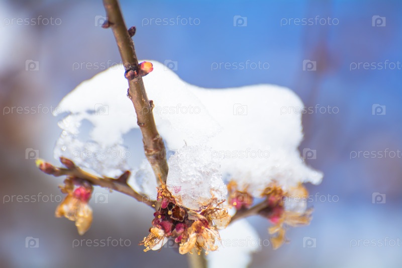 Весенние заморозки, цветущие абрикосы, яблони, под снегом