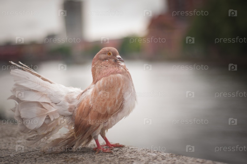 Голубь коричневого цвета с распущенным хвостом держит грудь вверх