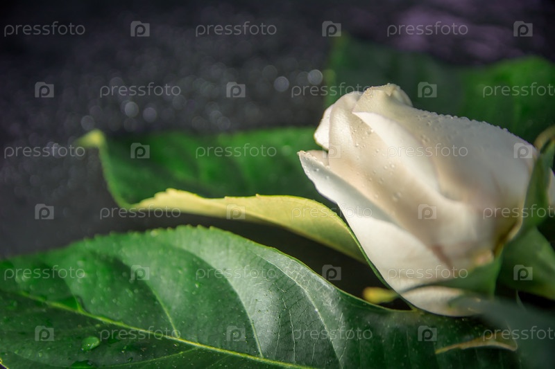 Один бутон белой розы лежит на большом зеленом листе