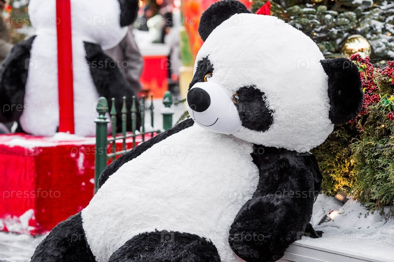 Мягкие плюшевые панды и китайские красные рождественские фонарики на Тверской улице в Москве. Крупный план. Первая в истории встреча Китайского Нового 2024 года в Москве