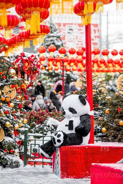 Мягкие плюшевые панды и китайские красные рождественские фонарики на Тверской улице в Москве. Крупный план. Первая в истории встреча Китайского Нового 2024 года в Москве