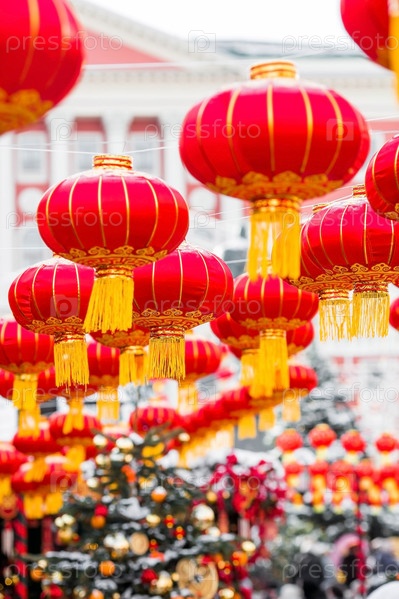 Китайские красные рождественские фонарики на Тверской улице в Москве. Крупный план. Первая в истории встреча Китайского Нового 2024 года в Москве