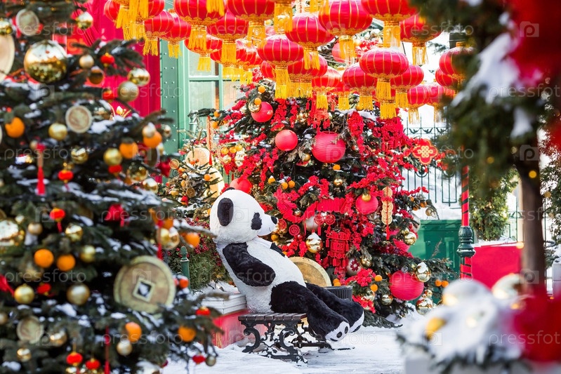 Мягкие плюшевые панды и китайские красные рождественские фонарики на Тверской улице в Москве. Крупный план. Первая в истории встреча Китайского Нового 2024 года в Москве