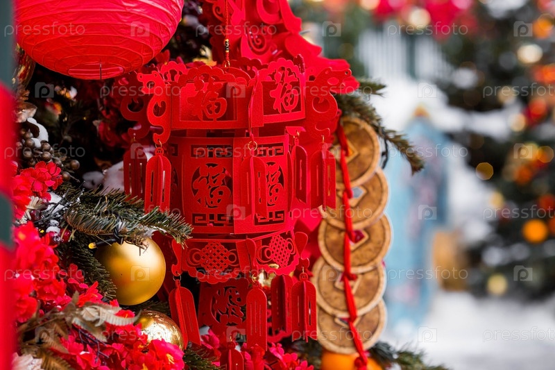 Китайские красные рождественские фонарики на Тверской улице в Москве. Крупный план. Первая в истории встреча Китайского Нового 2024 года в Москве