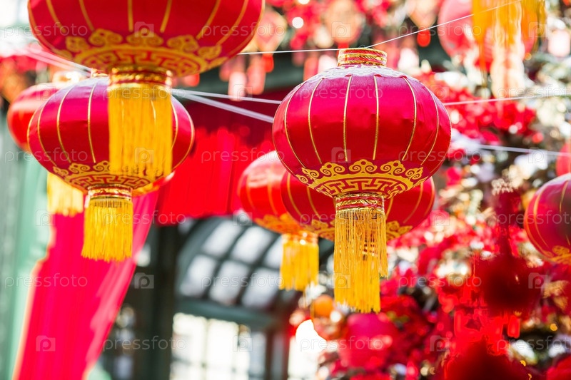 Китайские красные рождественские фонарики на Тверской улице в Москве. Крупный план. Первая в истории встреча Китайского Нового 2024 года в Москве